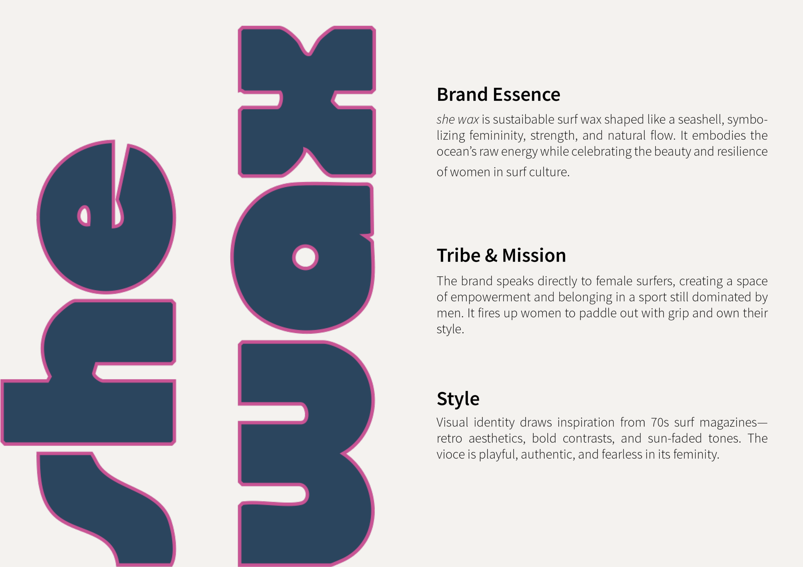 As part of my Graphic Design training, I created my own brand she wax—a sustainable surf wax inspired by the ocean and 70s surf culture. The project focuses on empowering female surfers through strong visual identity and modern femininity.