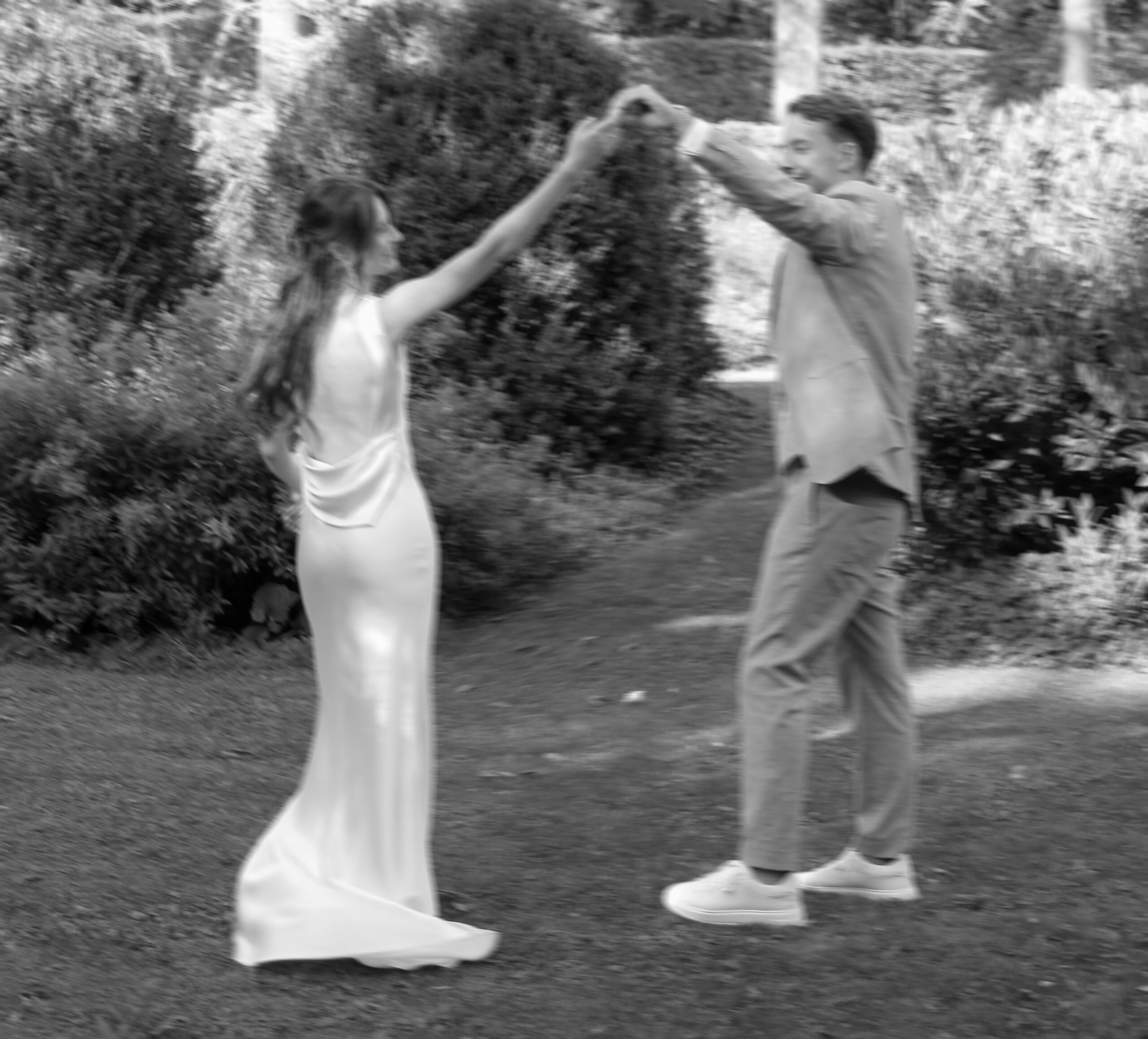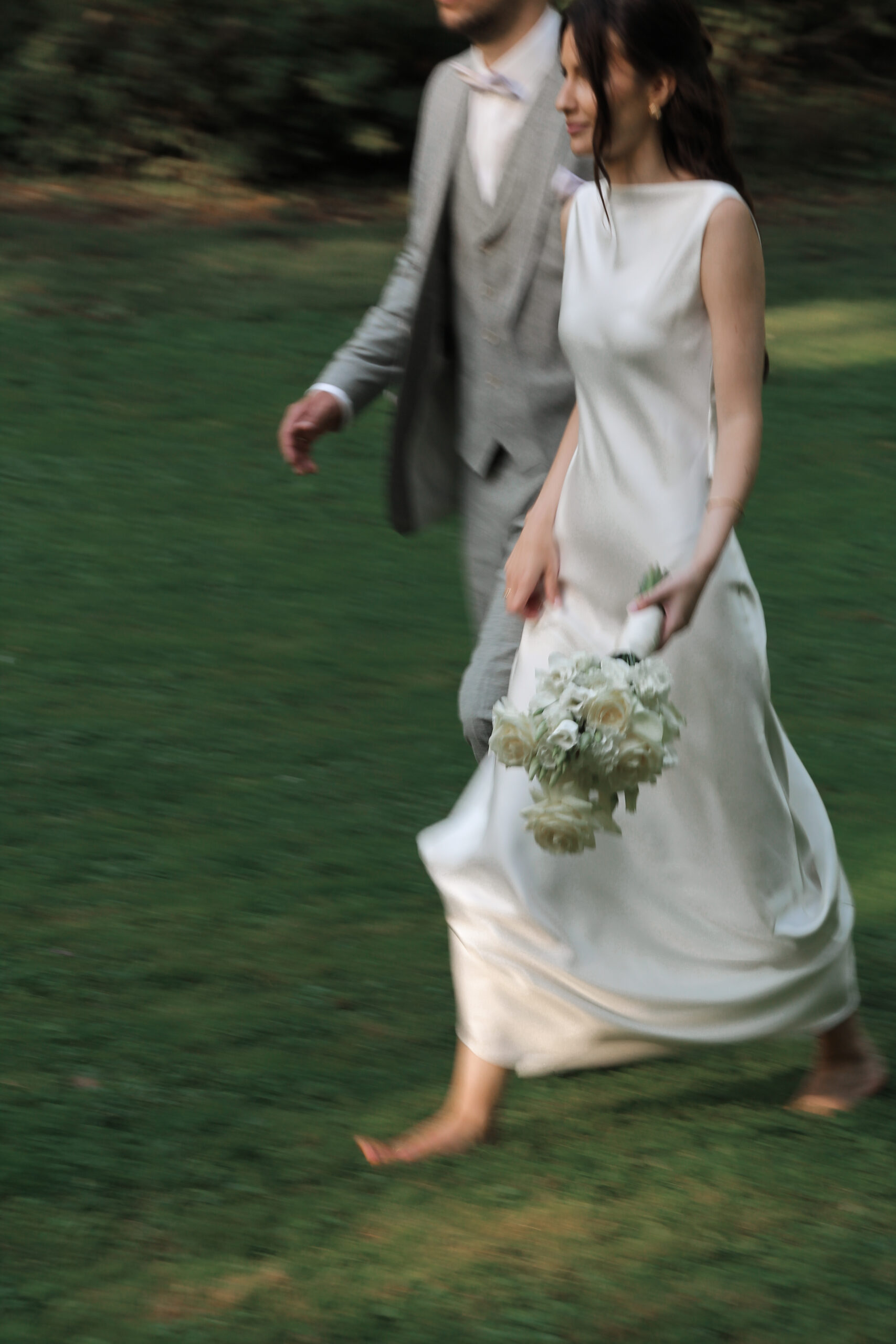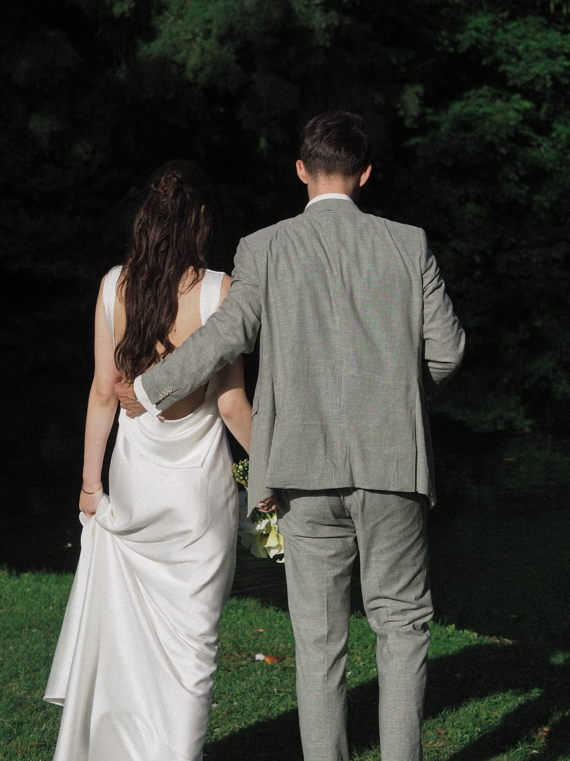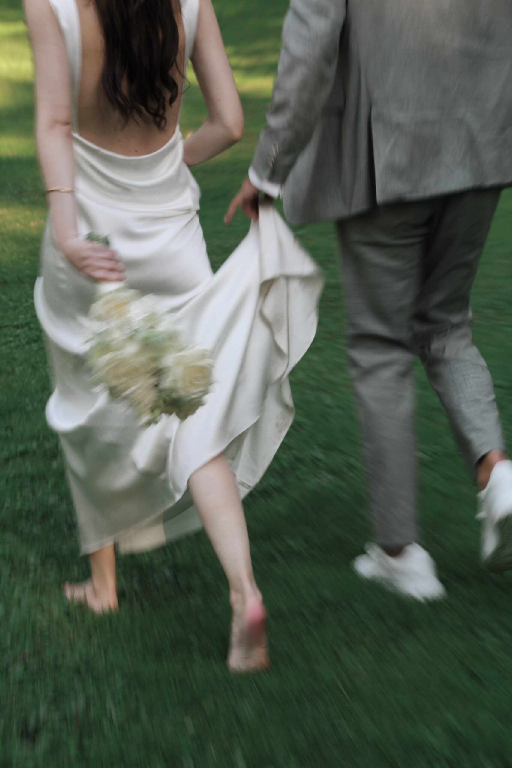 The wedding party has already started. We sneaked out for a bit. The freshly married couple stumbled into this scene, as they danced in their very own world through the wet grass. She was barefoot. He was holding the bridal train of her dress. Just like two little kids having fun doing whatever they are doing. Pure lightness. Ease.