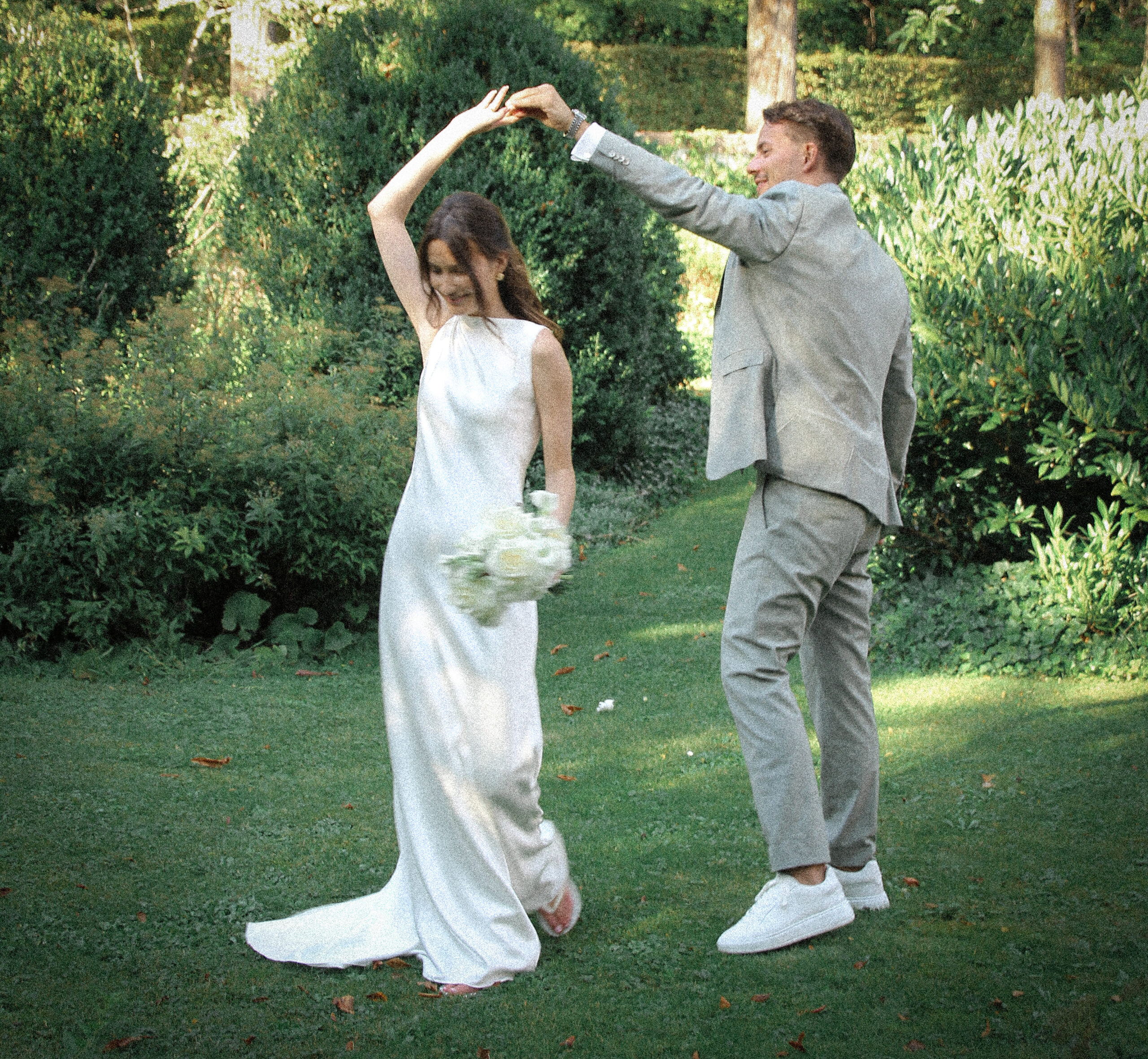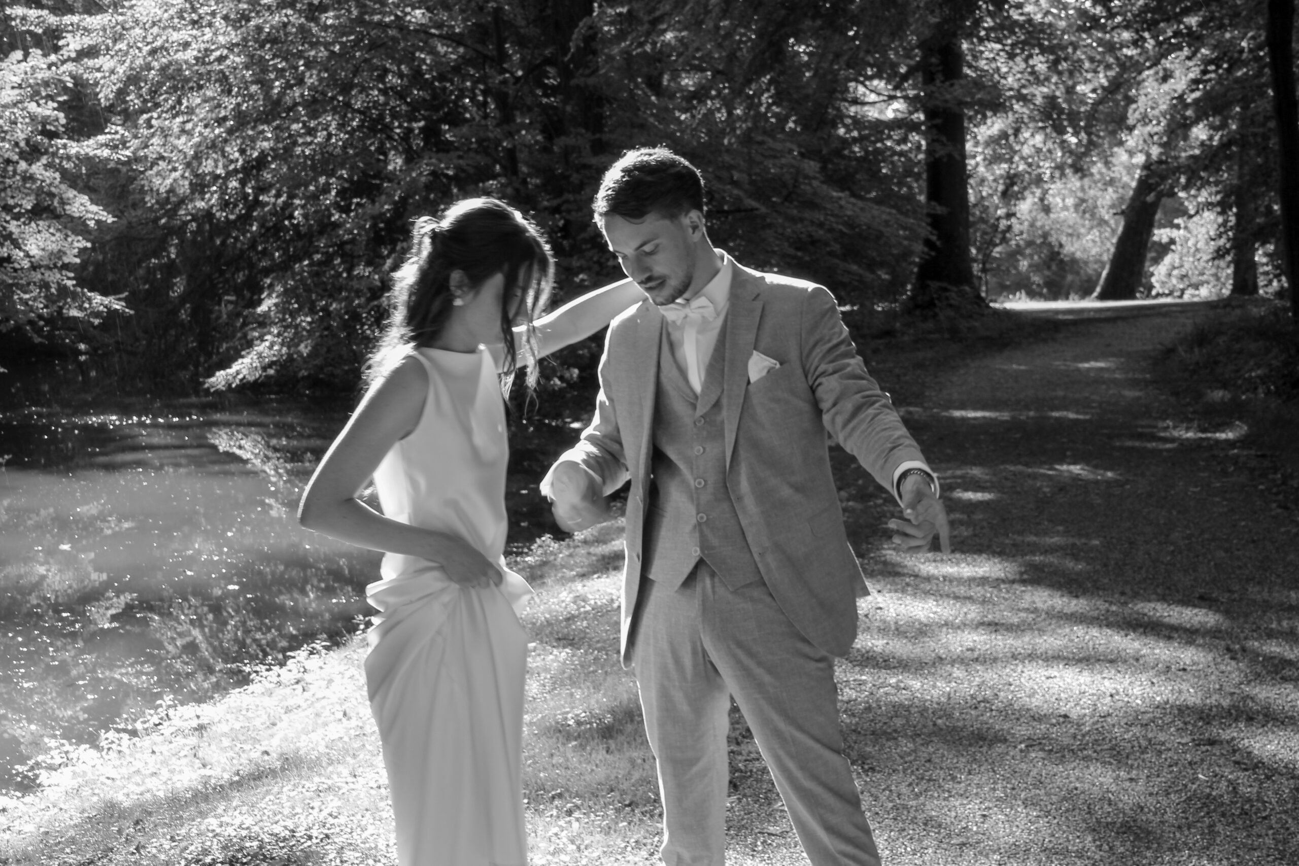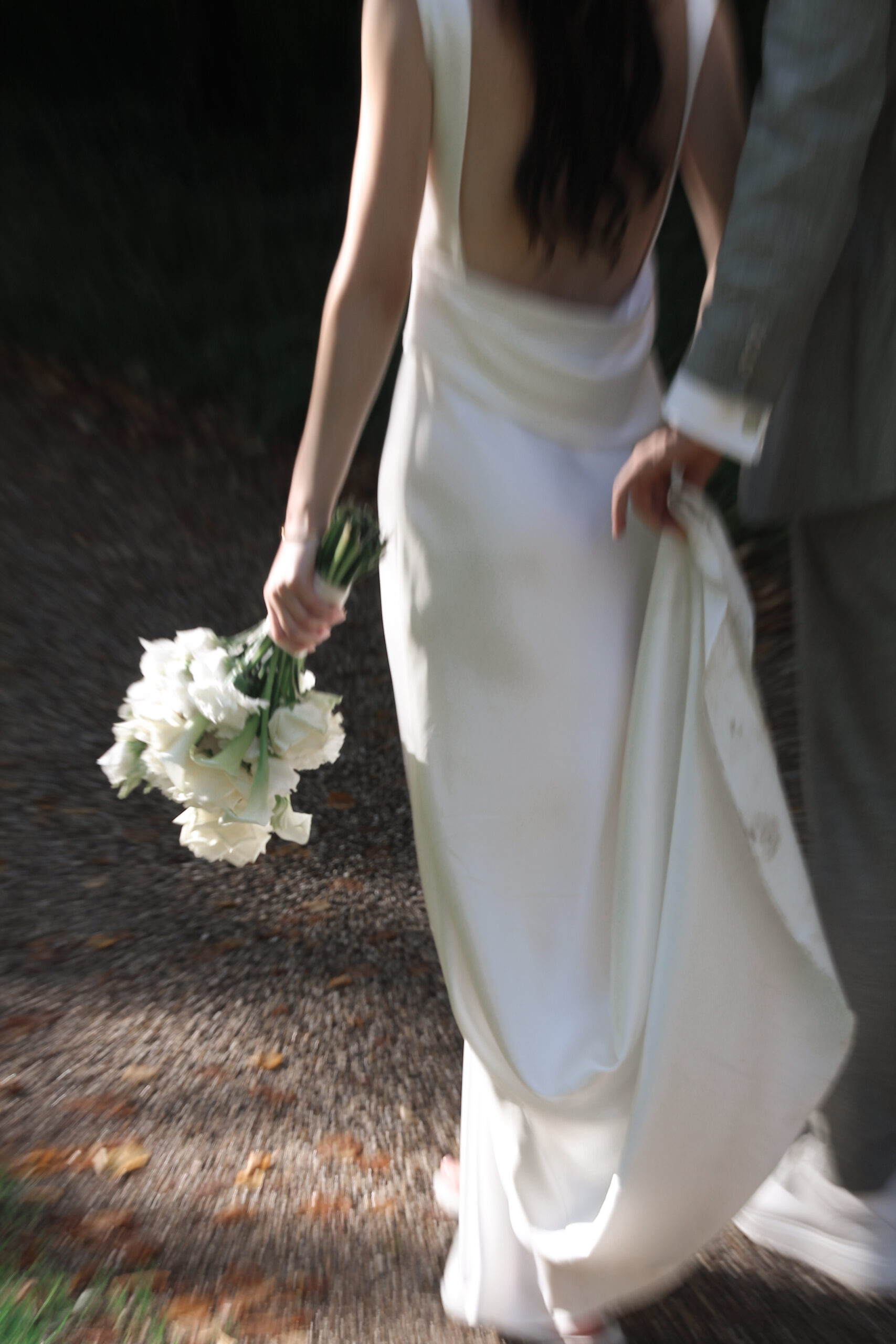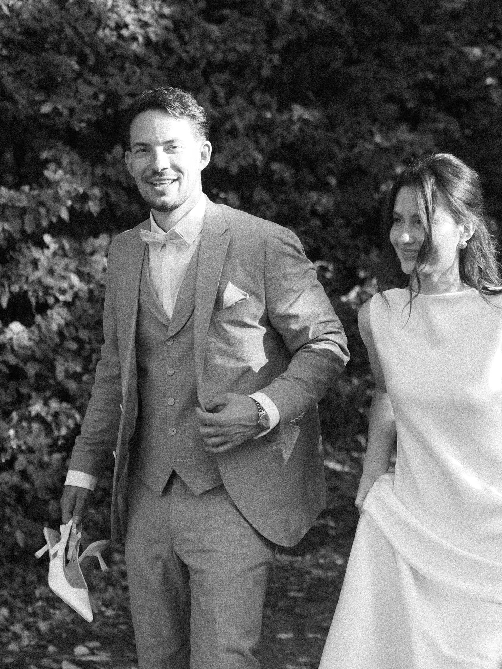 The wedding party has already started. We sneaked out for a bit. The freshly married couple stumbled into this scene, as they danced in their very own world through the wet grass. She was barefoot. He was holding the bridal train of her dress. Just like two little kids having fun doing whatever they are doing. Pure lightness. Ease.